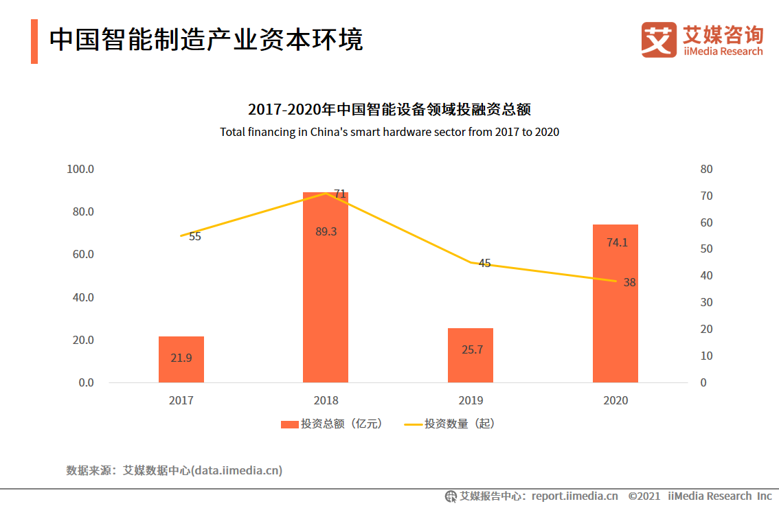iiMedia Research(艾媒咨询)数据显示,中国智能制造领域投融资总额度和投资数量分别从2018年的89.3亿元和71起后回落至2020年的74.1亿元和38起;而2019年中国智能制造A轮前融资事件中,A轮前后融资额(A轮、Pre-A轮、A+轮)占总数量的约47.0%。艾媒咨询分析师认为,投资总额和数量体现出资本对于智能制造领域保持关注,但是投资决策逐渐回归理性,投资逐渐集中于有一定技术和业务基础的优秀公司;而行业融资轮次分布体现出行业尚处起步阶段,还有巨大潜力有待挖掘。