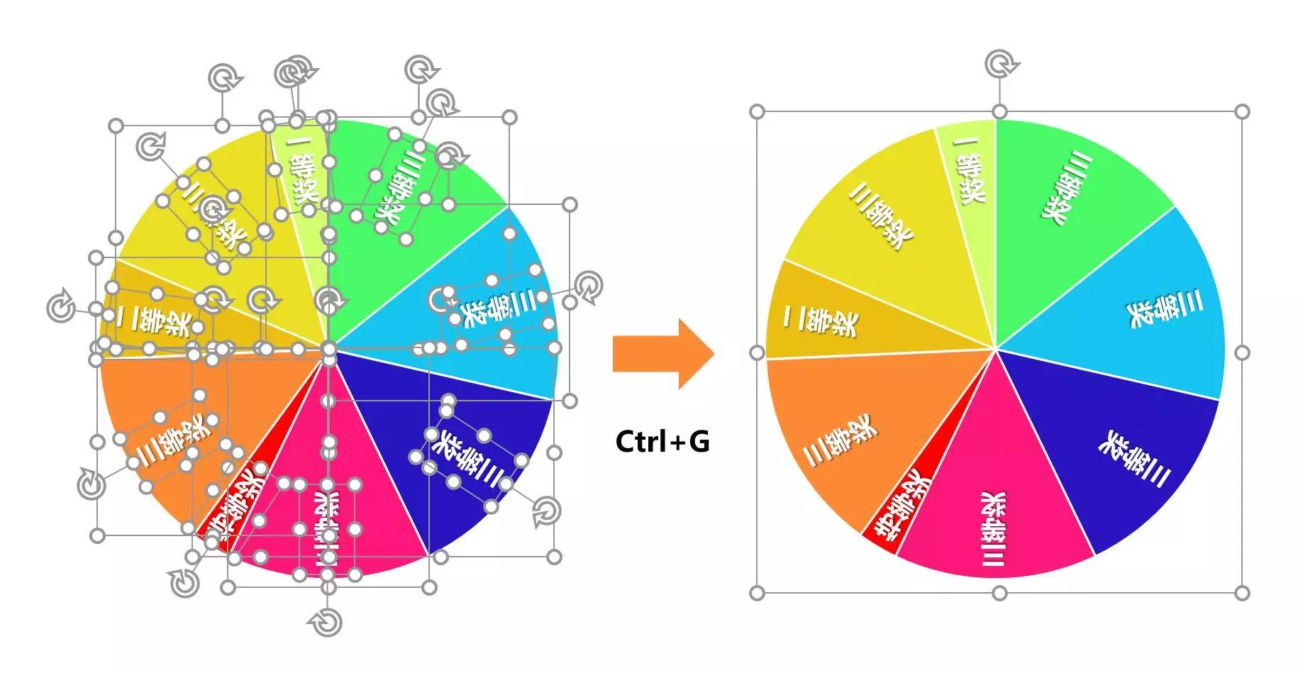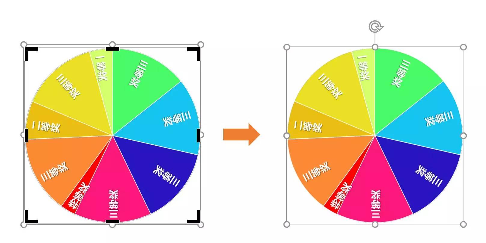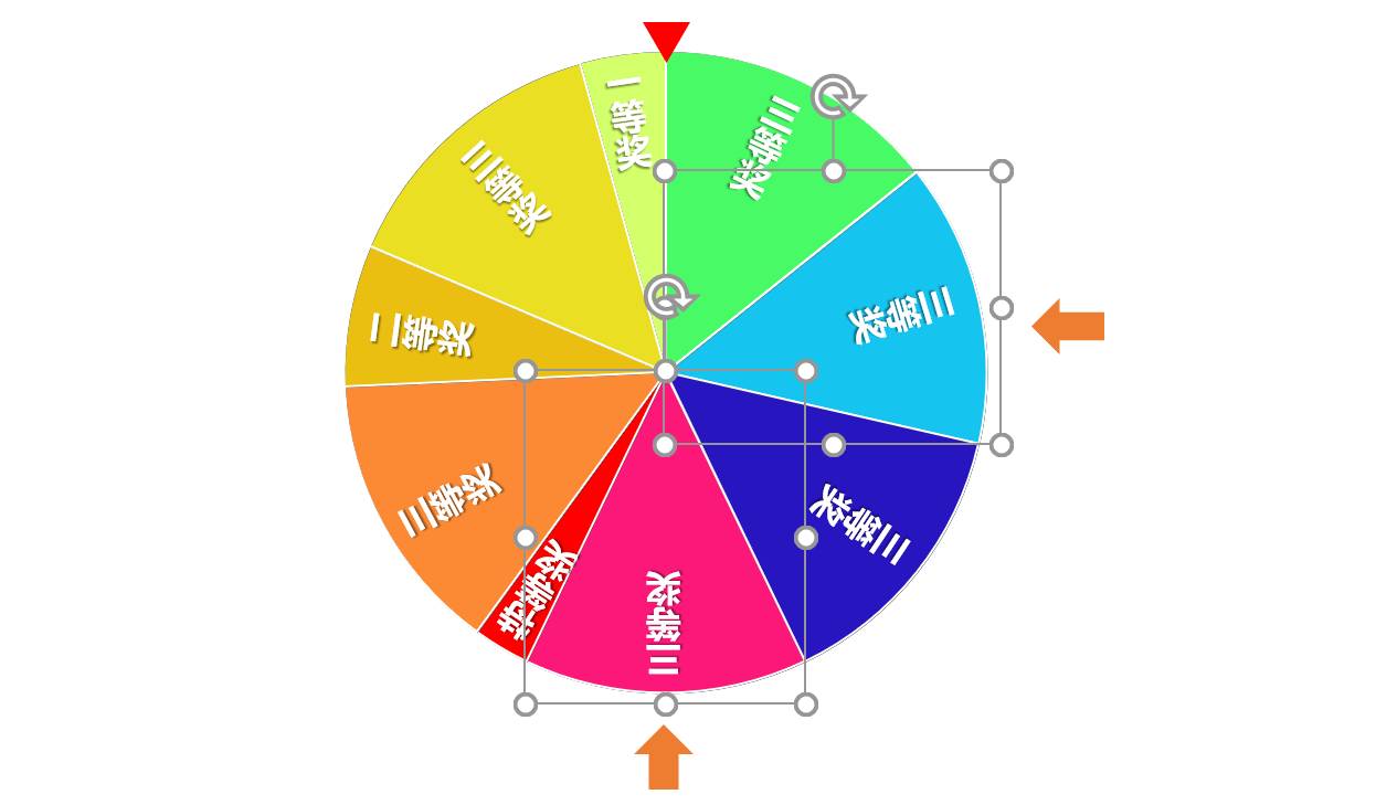 ❻ 使用【纵向文本框】写好奖项名称,分别旋转合适的度数放置到轮盘上,全选后【Ctrl+G】与轮盘编为一组,抽奖轮盘就制作好了: