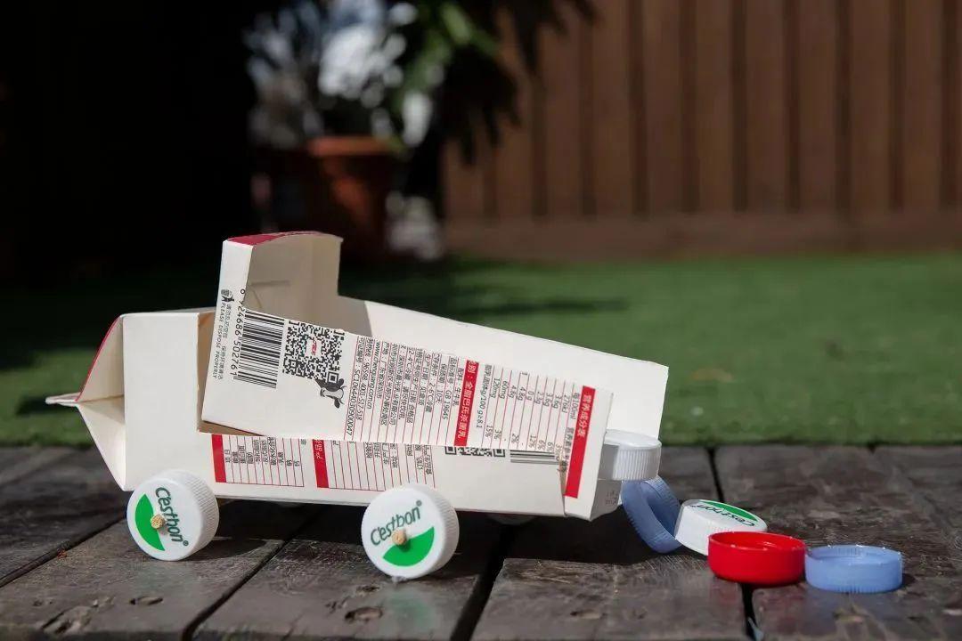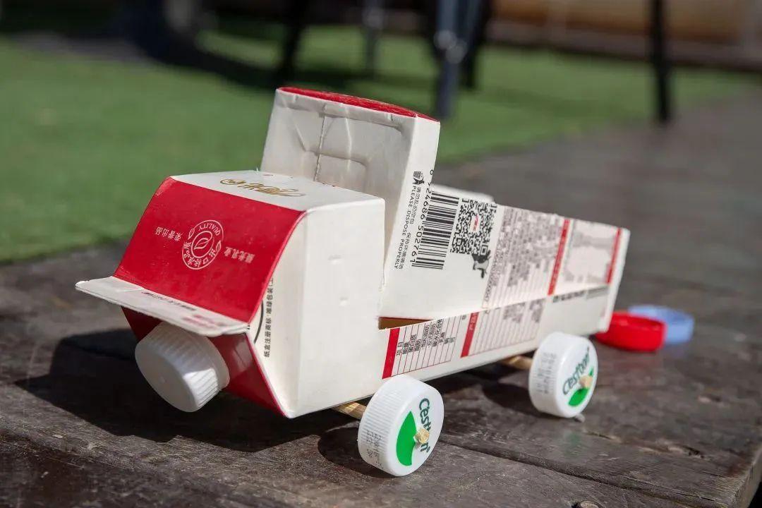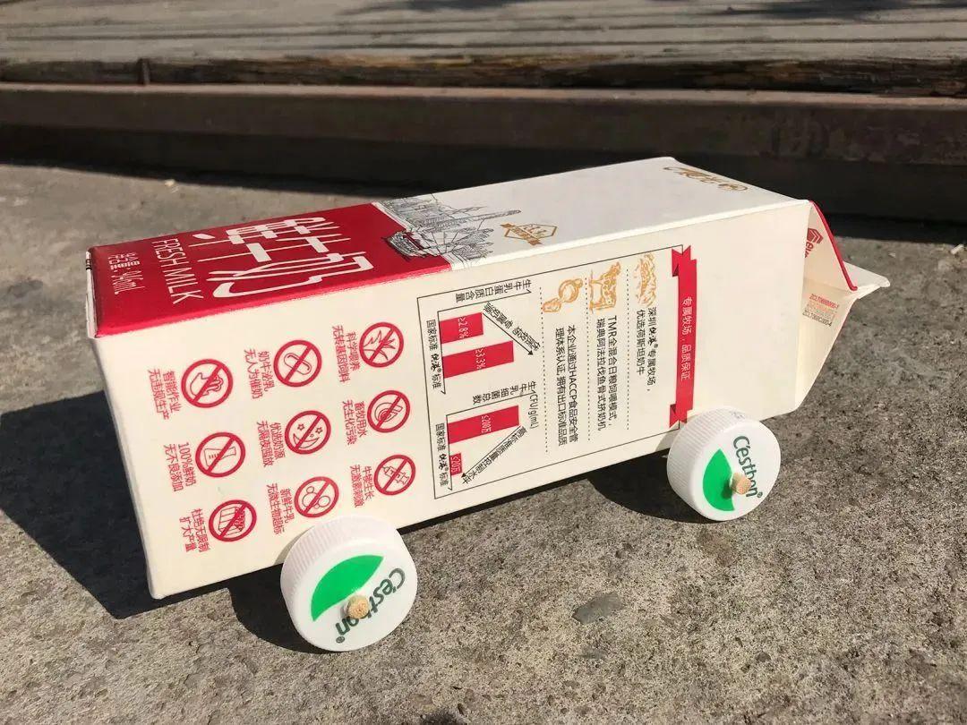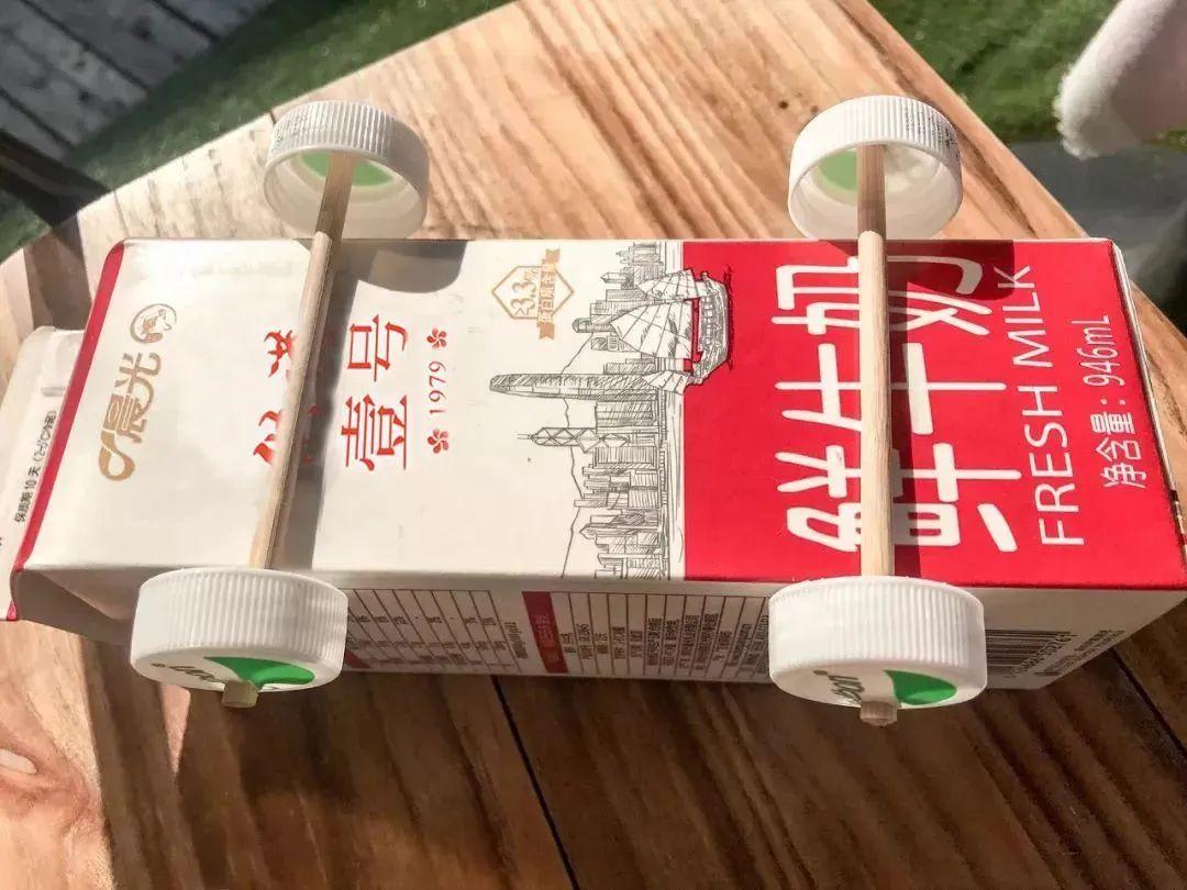 3、把做好的车轱辘妥妥地粘贴在牛奶盒上,一辆会动的小车车就这样完成了一大半;