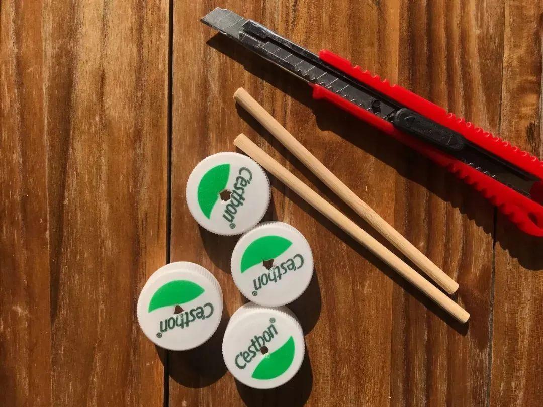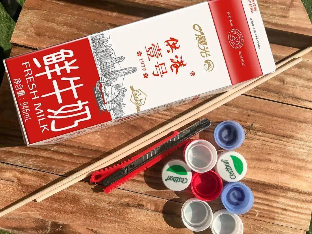 牛奶盒、4个大小相同的瓶盖和小木棍、透明胶带