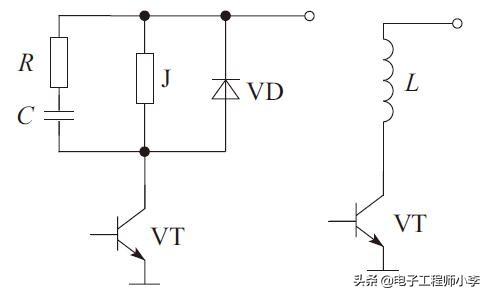 图8-10所示为继电器驱动电路中的二极管保护电路和继电器等效电路,电路中J为继电器,VD是保护用二极管,VT是驱动管,R和C是构成继电器内部开关触点的消火花电路。