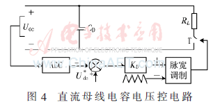 电子负载正常工作的条件是直流电容电压Udc大于输入电压的幅值。在图2的拓扑结构中,当uin>0时,V3,D4,D1,L,CD组成了一个Boost升压结构;当uin<0时,V4,D3,D2,L,CD组成另一个Boost升压结构。若控制不当,Udc可能比交流电压峰值高出很多,威胁到开关管的安全运行;若Udc低于交流电压峰值,则不能实现对iL的有效控制。对于能量消耗型非线性电子负载,被测试电源发出的电能在电阻上转换为热能释放,据此设计了直流母线电压控制电路,如图4所示。