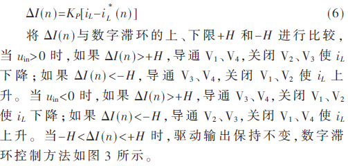 通常电子负载对目标电流指令采用单电流环控制,使电子负载对被测电源呈现出设定的iL=f(uin)负载特性。滞环电流控制以反馈电流作为控制对象,当功率管的开关频率较高时,能使系统具有较好的稳定性和快速性。这里选择单极性数字滞环控制方法对电子负载的输入电流iL进行控制,首先对输入电流iL采样,将iL与非线性负载目标电流做差,其差值送入放大系数为KP的比例环节,得到放大后的电流误差ΔI(n):