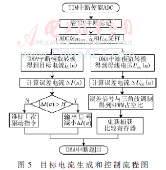 控制器采用STM32F103,其片上有3个12位的ADC模块,可同时对16个模拟通道进行采样,最高采样频率可达1 MHz。对非线性电子负载目标电流和直流母线电压的控制主要由STM32F103的TIM模块、ADC模块和DMA中断功能配合完成。目标电流合成及输出控制流程图如图5所示。