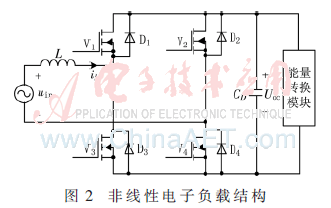单相非线性电子负载的结构如图2所示。图中uin为被测试电源电压,iL为电子负载的输入电流,Udc为直流母线电压,功率MOSFET管V1~V4及续流二极管D1~D4共同组成了桥式电路的四个桥臂,L为电子负载的输入电感,它用于储能和滤波,CD为电子负载的输出稳压电容,其后端连接能量转换模块。对于能量回馈型电子负载,该能量转换模块为DC/AC并网逆变器,一般以单位功率因数运行向电网回馈电能;对于能量消耗型电子负载,能量转换模块为耗能电阻。