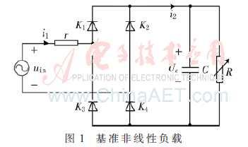 国标GB/T7260.3-2003规定的单相基准非线性负载电路如图1所示,该非线性负载由一个二极管整流桥及输出端电容、电阻并联电路组成,其中uin为被测试电源电压,r为串联线性电阻,K1~K4为整流二极管,C为稳压电容,R为调节负载输出功率的滑动电阻,i1为负载电流,i2为二极管整流电流。国标规定,被测试电源的测试条件满足额定电压和额定功率时,电路参数的取值按下述方法计算:UC=1.22Uin,C=7.5/fR,其中Uin,S,f分别为被测试电源的额定电压有效值、额定视在功率及工作频率;UC为直流电容电压平均值。