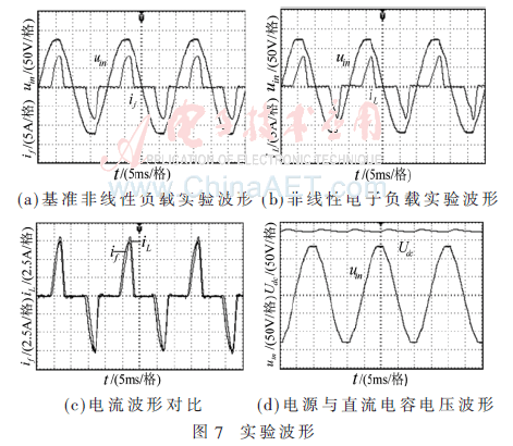 图7(a)所示为基准非线性负载的电压、电流实验波形,图7(b)所示为单相非线性电子负载模拟基准非线性负载的电压、电流波形,图7(c)所示为基准非线性负载和非线性电子负载在并联时的电流的对比图,图7(d)所示为被测交流电源电压和非线性电子负载直流电容电压的波形。由图7(a)、(b)和(d)可知,非线性负载电流变化剧烈,由于系统存在线路电抗,谐波电流已经导致输入电压发生畸变,说明非线性负载对电源稳定性的要求比线性负载更为严格,同时证明了本文提出的控制系统的良好稳定性。