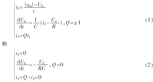 忽略二极管的导通压降,对基准非线性负载进行分析。设Q为二极管的导通函数,当uin≥UC时,K1、K4导通,Q=1;当uin≤-UC,K2、K3导通,Q=-1;当|uin|<UC时,K1~K4均不导通,Q=0。取整流电流i2和电容电压UC作为系统的状态变量,当非线性负载进入稳态后,可得电路的状态方程为: