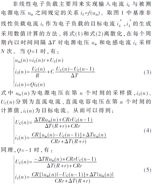 随着具有非线性特性的电力电子设备的广泛应用,电流谐波给电源带来输出电压失真和负载效应问题越来越不容忽视,故电源出厂前要进行非线性带载能力测试以评价电源的稳态性能[1]。传统的非线性负载由整流桥和耗能电阻等无源器件搭建,其装置自动化程度低,参数不易调节。而电子负载具有体积小、阻抗不受温度影响等优点,通过改变电流指令可以实现对模拟负载性质和大小的灵活调节[2-3]。电子负载对非线性负载模拟的难点在于非线性目标电流的生成[4],而目前对这方面的研究较少。文献[5]通过将周期电流函数用傅里叶级数展开,求解出各次电流谐波的幅值和相位,能够精确再现出非线性负载的电流波形,但该方法计算繁琐,不易实现。文献[6]利用CORDIC算法结合插值算法求解整流电路导通角和关断角,但该方法占用大量RAM,不利于提高计算速度,目前只有相应的仿真研究。文献[7]将单相不可控整流电路输入电流的断续状态等效为非线性系统中的死区效应,建立了非线性负载电流指令映射关系表,通过查表实现对开关器件的触发,但该方法不能反映电源的动态变化。