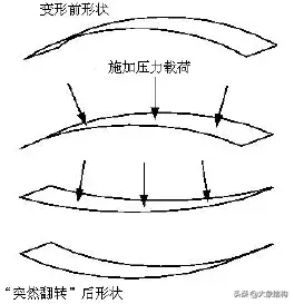 不难理解大挠度和大转动对结构承载的方式会产生显著的影响。然而,并不一定位移相对于结构尺寸很大时,几何非线性才显得重要。考虑一块很大的具有小曲率的板在所受压力下的“突然翻转”。