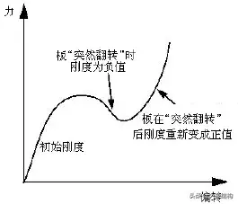 板的刚度在变形时会产生剧烈的变化。当板突然翻转时,刚度变负;尽管位移量值相对于板的尺寸很小,但是有明显的几何非线性,必须在模拟中加以考虑。