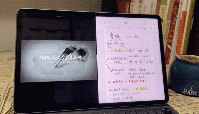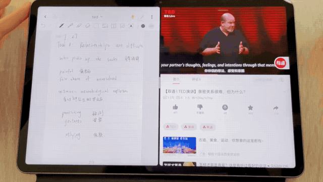 而且悬浮的窗口也可以调节大小,上下分屏也同样支持,边看视频边做记录,让屏幕得到了更高效的利用,实现短时间集中高效处理学习任务的效果。