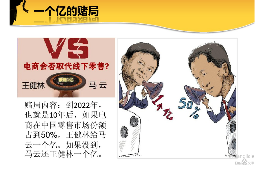 同学们,在上课前请先看下多媒体课件,课件上呈现的这位“大佬”你们认识吗?一位是王健林,一位是马云。这两个时代风云人物也是有着对中国经济发展独特的眼光,为此曾经设下“一个亿的赌局”?什么赌局?我们来看一看。
