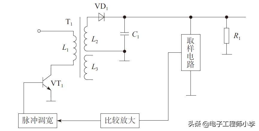 电路中VT1基极开关的脉冲为低电平时,VT1截止,Ll产生反向电动势,其极性上面为负,下面为正,这一脉冲电压由变压器耦合到二次绕组L2,极性改变。这一电动势使得VD1导通,电动势所产生的电流流过VD1,对Cl充电,此期间完成将Ll中的磁能转换成Cl中的电能。在这一电路中,改变VT1基极脉冲的特性,也就改变了稳压电路输出电压的大小。