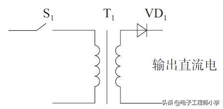 电路中VT1基极开关的脉冲为高电平时,当VT1导通,输入电压产生电流流过一次绕组,与导通的VT1构成回路,此时将电能转化为了磁能并且存储在了一次绕组中。