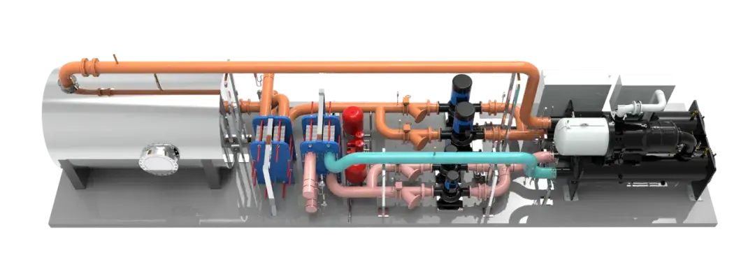 余热回收高效集成热站以EK 工业高温热泵为核心,可利用工厂15~75℃各种低品位余热废热,制取60~120℃高温工艺热水/蒸汽,代替传统燃油/燃气锅炉、电锅炉,节能率高达57%。