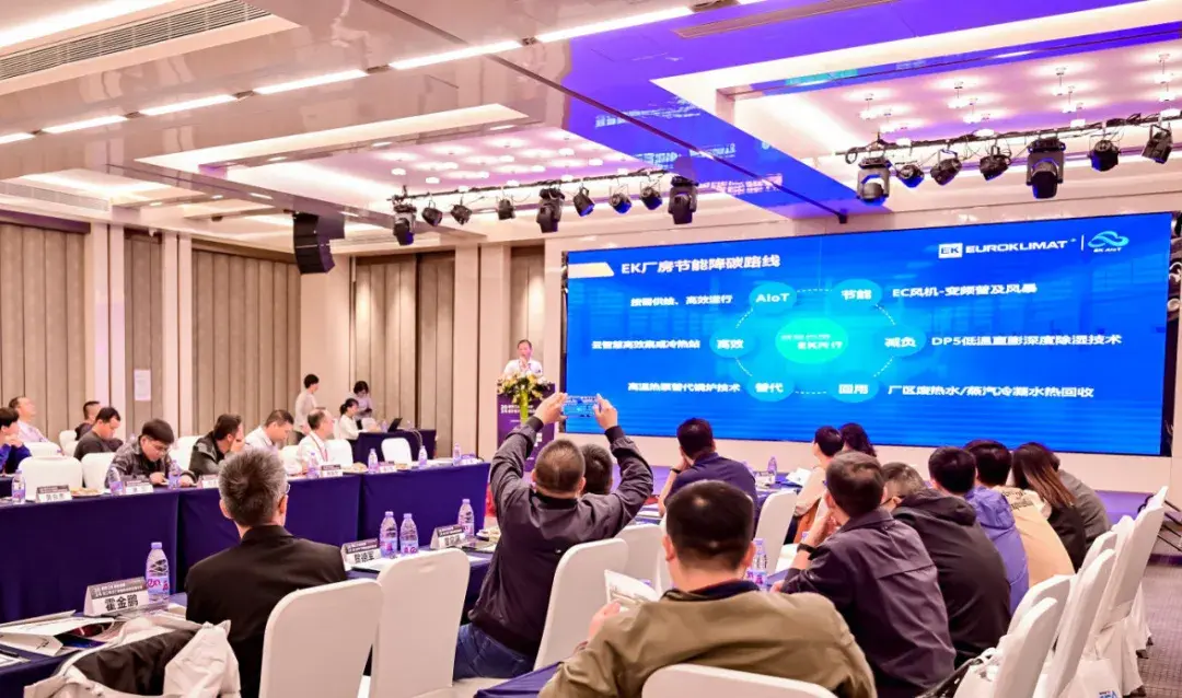 深入交流促提升,凝聚智慧共前行。会上,EK 工业行业高级经理蔡晓辉以《轻工电子厂房节能低碳综合解决方案》 为主题,向与会嘉宾介绍以“AIoT、 节能、减负、替代、回用、高效”为关键词的EK 厂房节能降碳路线和工业领域的核心节能产品,展示EK 工业空调如何以更节能、低碳、智能的技术方案和产品支持轻工电子厂房绿色可持续发展。