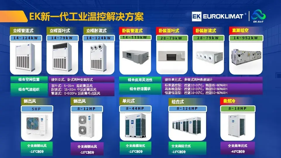 EK 工业多联采用变频及自然冷节能技术,提供管道式、百叶式、射流式多样化送风形式,结合应用灵活性提供单元式、多联式两种形式,产品涵盖标准冷暖型、再热除湿型、恒温恒湿型,全面满足制造厂房、配电房、仓库等工业常见温控场景需求。