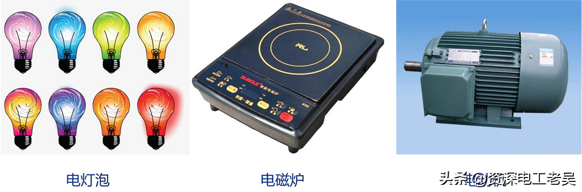 下图所示为用电负载电灯、电炉、电动机负载。