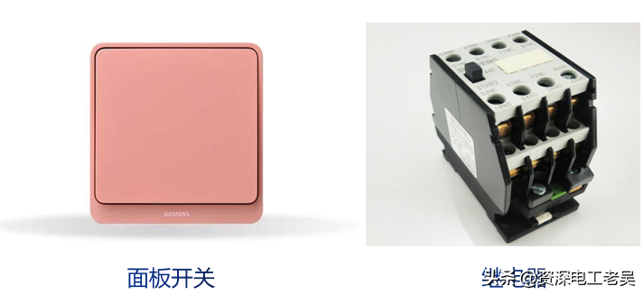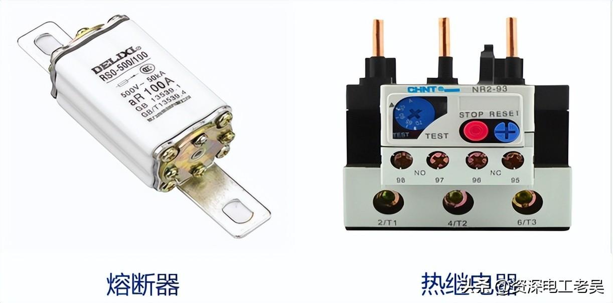 保护控制装置主要作用是控制电路的通断,如面板开关、继电器等。此外,有些电路还装有保护装置,以确保电路安全可靠地运行,如熔断器、热继电器等,如下图所示。