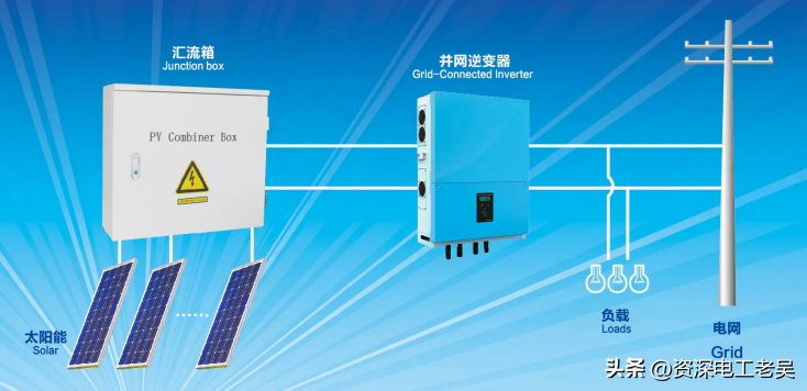 下图所示为光伏发电系统应用电路。光伏发电组件,将太阳能转换成为直流电,经配电线路连接至并网逆变器,并网逆变器将光伏发电发出的直流电转换成交流电,经配电线路供给照明灯具等用电负载,并与供电部门的电网并网。