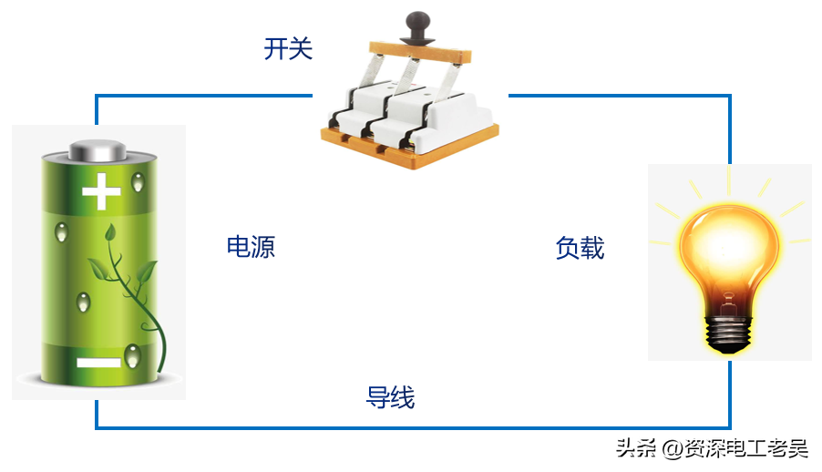 一个完整的电路一般由电源、负载、导线、控制装置四部分组成。下图为一个典型的电路,由电池、灯泡、开关和导线组成的电路。