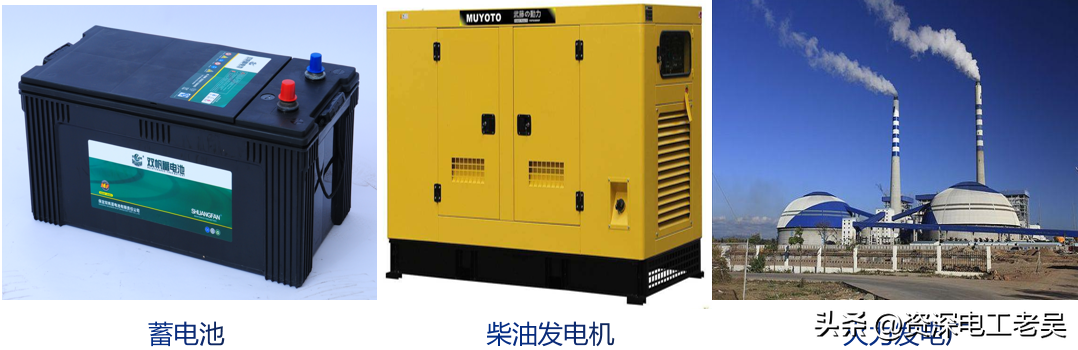 电源的作用是将其他形式的能转换成电能,它是为电路提供电能的一种设备或设施。常见的电源有干电池、蓄电池、柴油发电机、火力发电厂等等。下图所示为三种电源,分别为:蓄电池,将化学能转化成电能;柴油发电机,将石化燃料柴油转化为电能;火力发电厂,将石化燃料煤转化为电能。