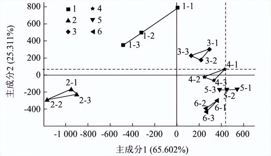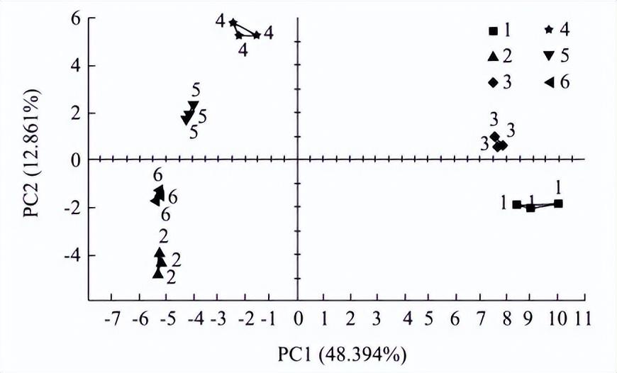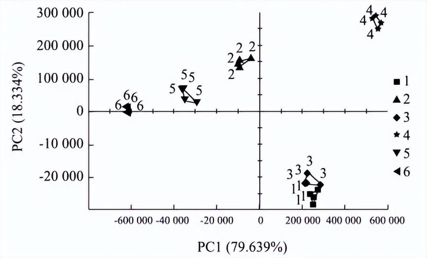 图2为六个样品的主成分分析图。从图中可以看出,PC1为79.64%,PC2为18.33%,总的贡献率97.97%大于80%,说明这两种主成分代表了大部分的样品信息。从PC1看1、3号大曲酿造金银花酒、2号小曲酿造金银花酒、5号小曲泡制金银花酒、4号大曲配制金银花酒四种生产类型的金银花酒得到了很好的区分,同时小曲酿造白酒与金银花酒类也区分开来,1号和3号样品同为大曲酿造酒,因此差异较小,区分不明显;从PC2看,1、3号大曲酿造酒与其它金银花酒得到了很好的区分,与其他金银花酒样品的间距较大,6号小曲酿造白酒与5号小曲泡制金银花酒间距较小,但基本可以进行区分。