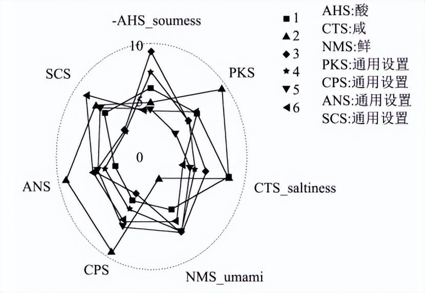 电子舌系统采用第六套传感器系统,包括AHS、PKS、CTS、NMS、CPS、ANS、SCS共7根传感器。实验开始前,对电子舌仪器的味觉传感器系统进行活化、校正、诊断,待传感器通过后开始实验。将6个样品置于20℃的恒温水浴锅中,量取25mL样品于电子舌专用烧杯放入传感器进行检测。单次信号采集时间为120s,每次分析时间为3min。每检测一个样品对所使用的传感器用蒸馏水进行一次彻底清洗,清洗时间为10s。每个样品进行3次重复。