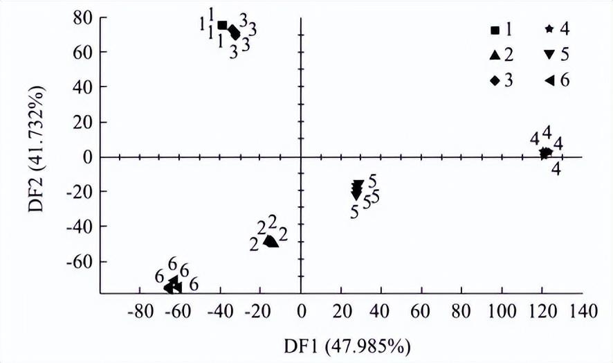 对样品进行判别因子分析,结果如图3所示,DF1为47.99%,DF2为41.73%,总的贡献率89.72%,6个样品均能好地区分开来。DF1中4号大曲配制金银花酒和5号小曲泡制酒与其它样品的间距较大得到很好的区分;DF2中6号小曲酿造白酒与其他金银花酒类得到了明显的区分。1、3号大曲酿造酒和2号小曲酿造金银花酒在DF1中间距较小,区分度低,但在DF2中的间距较大,整体能够得到很好的区分。