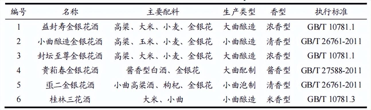 本实验采用不同生产类型的5种金银花酒和1种小曲酿造白酒为研究样品,详见表1。