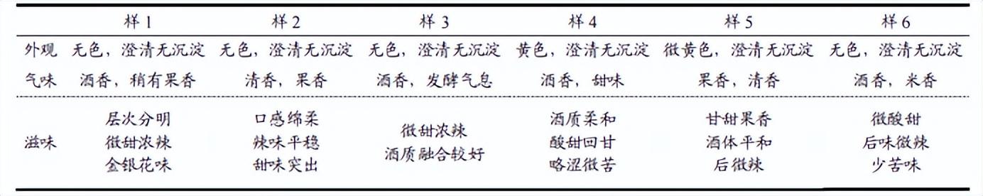 选取经过相关培训合格的专业人员组成5人评定小组,其中2名为女性,3人为男性。要求感官灵敏,掌握各类香型酒类的特征。品酒环境适宜,无杂余气体。感官评价方法及评价标准参考白酒分析方法。感官评价小组人员单独对六种样品进行品评,每测完一种样品,品评人员漱口后进行下一种。对样品的评价要公正、科学、准确,分别从色泽、香气、滋味三个方面对样品进行评价。
