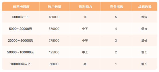 5000元以下的小额信用卡竞争最为激烈,准入门槛低、额度小、客户通常作为日常消费使用,一般都能准时还款,做分期的少,银行获取利息收益也就少;虽然用户基数大,但是盈利能力却低,因此在战略上选择保持。