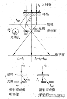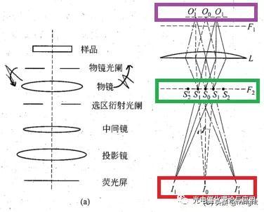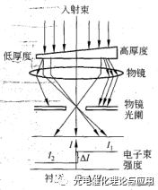 利用电子束透过薄膜样品通过加入中间镜和投影镜可以实现类似的过程,当改变中间镜电流,使其物平面从物镜像平面移动至物镜后焦面,即可得到衍射谱,如果移动到物镜像平面,则可得到物体的像。因此,使用透射电子显微镜,我们既可以观察到衍射谱,也可以直接看到物体的像。