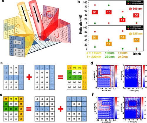 图1.波长和偏振双重调控的可切换图像。(a)可切换图像的示意图;(b)在入射波长分别为666 nm和625 nm时,不同几何尺寸的HMM的同极化和交叉极化反射率;(c)入射波长为666 nm时的图像设计:左图案和中间图案分别是由同极化和交叉极化控制的图像(数字“ 4”和“ 7”),而右图案可确定多路复用图像的排布;(d)波长为666 nm入射光照射时,RCP分量(左)和LCP分量(右)的电场分布;(e)可切换图像在625 nm的RCP辐射下可解码为中间图案(由RCP检偏器确定)和右图案(由LCP检偏器确定);(f)波长为625 nm入射光照射时,RCP分量(左)和LCP分量(右)的电场分布。