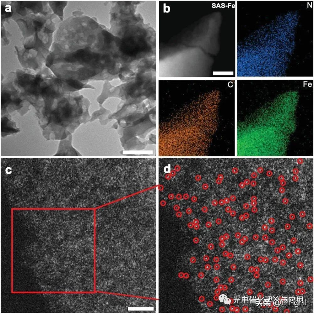 1 可以有根据的使用透射电镜,优化我们看到的样品,比如明场像,暗场像的使用,使得我们的目标样品能够得到比较明显地展示,暗场像结合mapping可以更好地显示出样品的大小和在纳米颗粒在催化剂中的分布情况。比如文章中常见的下图形式,通常是结合一个低分辨的透射图像,加暗场像和mapping,以及球差电镜中标记出的单原子铁图像。其中,铁由于与周围其他元素的原子序数不同,形成衬度差异。一般,原子序数越高的元素,对电子散射更严重,其明场像亮度会越暗。