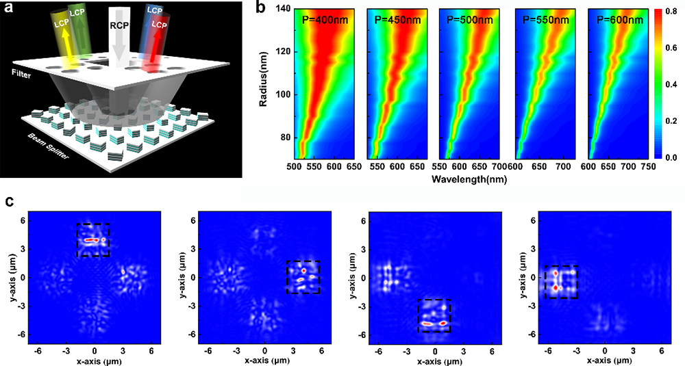 图2. 基于3D集成超表面的多维度调控分束器。(a)滤波器与宽带分束器垂直堆叠而成的3D集成超表面的示意图;(b)滤波器超表面在不同周期(P)和半径下的透射光谱; (c)3D集成超表面在不同入射波长下的x-y平面电场分布:529 nm,569 nm,635 nm和675 nm。