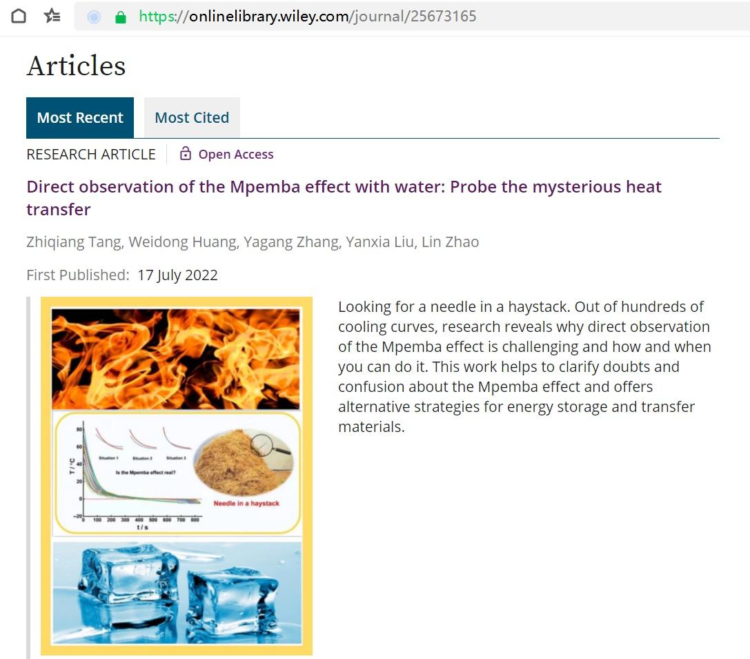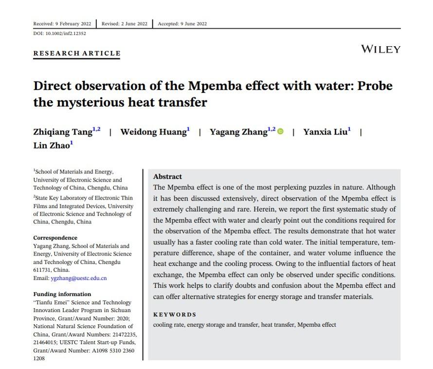 近日,电子科技大学材料与能源学院张亚刚教授团队在国际著名学术刊物 Infomat 发表了题为“Direct Observation of the Mpemba Effect with Water – Probe the Mysterious Heat Transfer”的研究论文 (https://onlinelibrary.wiley.com/doi/full/10.1002/inf2.12352),首次通过在水中系统的实验研究,发现了在水体系中直接观察到Mpemba 效应的条件,破解了Mpemba 效应之谜。硕士研究生唐志强、黄维东为论文共同第一作者,张亚刚教授为论文通讯作者。电子科技大学为论文第一单位和唯一通讯单位。