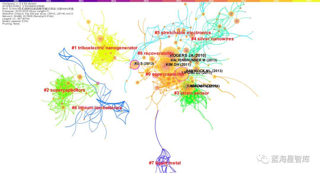 我们在Web of Science上检索了2015年至2019年与柔性电子有关的6842篇论文,其中美国国防部资助发表论文共325篇(空军研究办公室资助发表论文132篇、海军研究署38篇,陆军研究办公室22篇,DARPA 17篇)。我们采用Citespace软件进行文献计量分析。可以看出,目前柔性电子的典型研究主题包括超级电容器、摩擦纳米发电机、应力传感器、银纳米电极、可拉伸电子器件、锂离子电池、液态金属等。其中,超级电容器、纳米发电机、锂离子电池均属于柔性电源,是柔性电子的重要构成部分。此外,柔性电子的研究内容还包括电子皮肤、健康监测、柔性显示等。