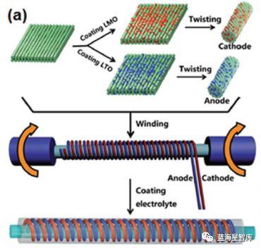 纤维状柔性超级电容器的直径一般为μm~mm级,主要结构包括平行纤维、绞合纤维、同轴纤维三种。平行纤维方案使用平面基板,可在平面上集成大量纤维实现规模化,达到一定的比功和比能要求,用于薄膜电子设备。绞合纤维和同轴纤维方案则无需平面基板。绞合纤维是将两条纤维电极捻在一起,中间由固态电解质等隔开,电极间存在少量的直接接触,内阻较高,一旦电解质失效,这种直接接触会导致较高的漏电电流。同轴纤维是在核心纤维电极上进行逐层组装制造,并使用固态电解质和外电解质层分隔。这种方案的电极接触性能、弯曲性能较好,但在细纤维上的逐层组装较为困难,模块化能力较差。