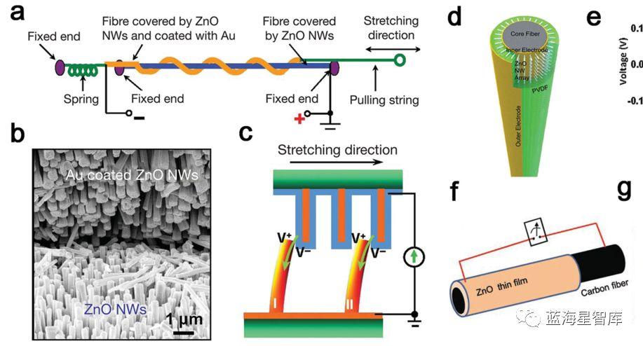 图11 ZnO纤维制成柔性压电纳米发电机(左为在纺织纤维周围径向生长ZnO纳米线,右为ZnO纳米线和PVDF膜构成的复合结构)