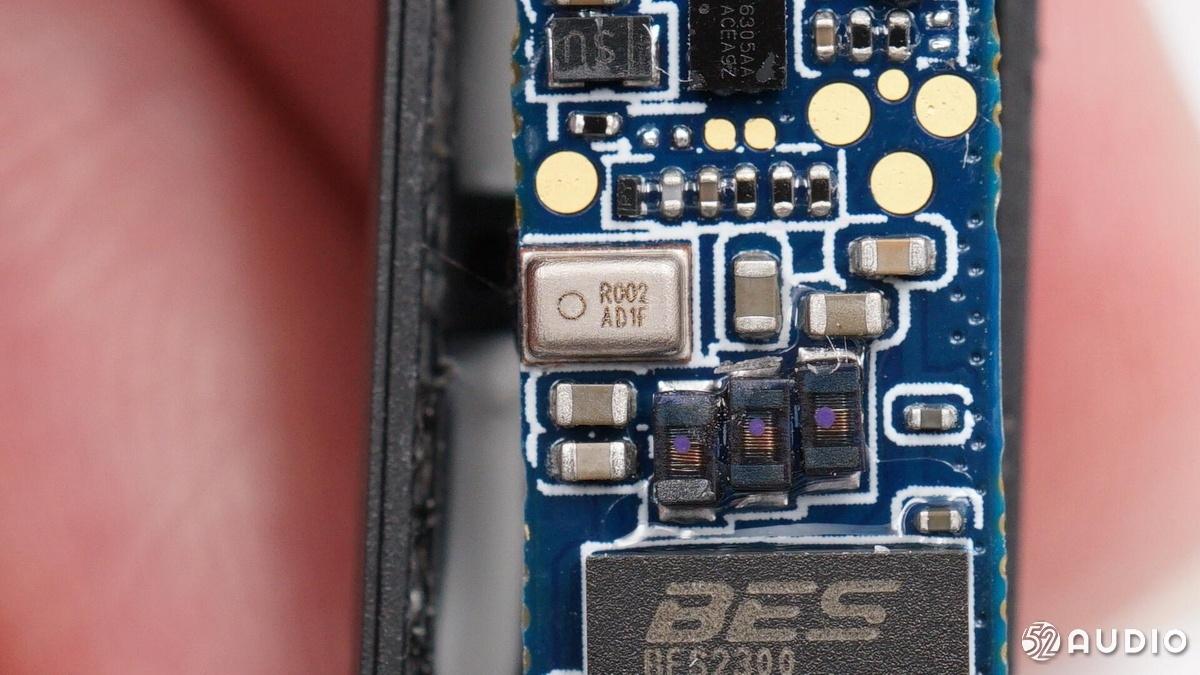 耳机主板位于右侧线控板腔体内,主控芯片为BES恒玄BES2300,集成自适应主动降噪技方案,支持蓝牙5.0,一颗芯片实现高音质和主动降噪效果;输入采用瀚昕微 HP2601 过压保护及锂电池充电器前端保护IC,还采用了赛微CW6305锂电池充电IC,赛微CW2017 电量计芯片等。