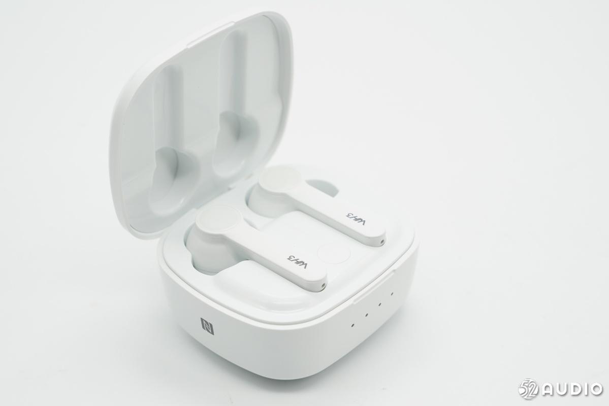 HiBy海贝WH3耳机和充电盒设计简约,盒盖上有银色磨砂区域凸显“HiBy海贝”的品牌Logo,耳机柄上有产品型号“WH3”,字体设计和合理的布局让这款产品看起来和拿在手上都比较有品质感。