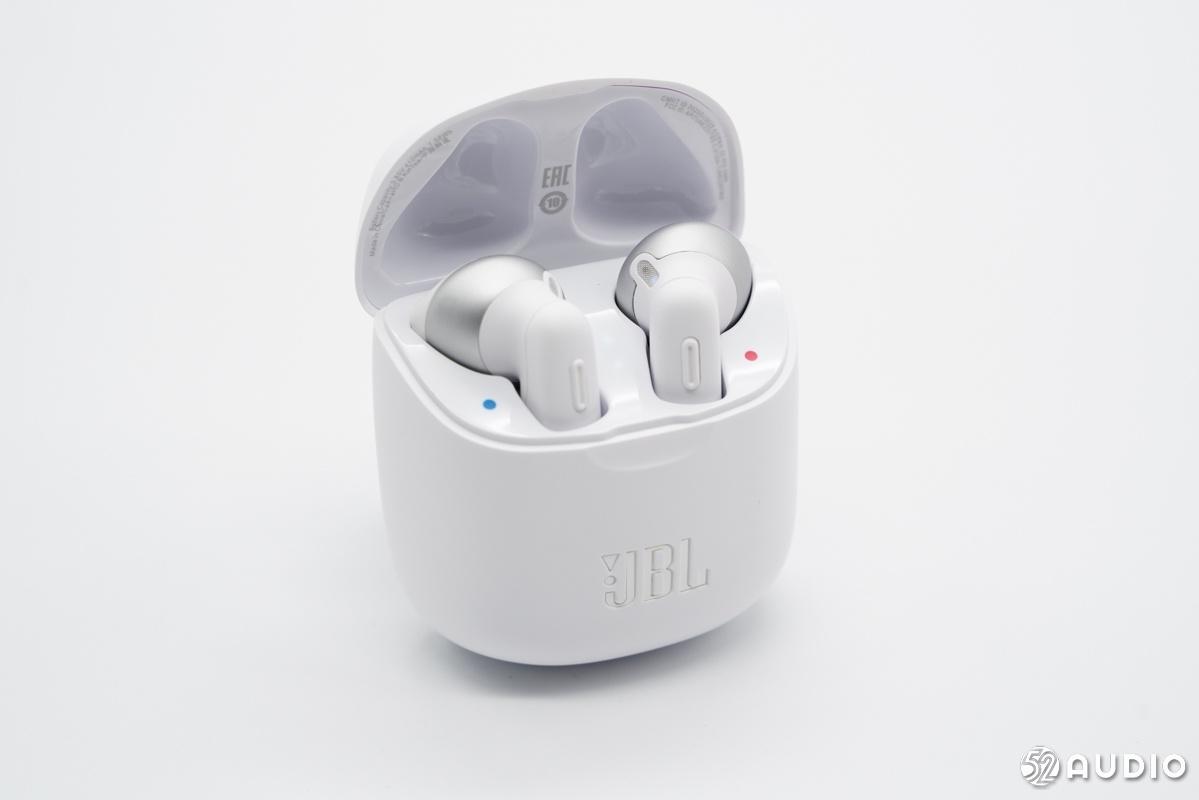 JBL TUNE 225 真无线蓝牙耳机外观设计比较用心,充电盒采用“梯形”的外观,打开盒盖第一观感很好,突出了耳机上的银色镀膜和按键设计,耳机防尘网和充电座舱用颜色区分左右,耳机和充电盒的指示灯也都隐藏得比较巧妙,在ID设计上花了不少心思。
