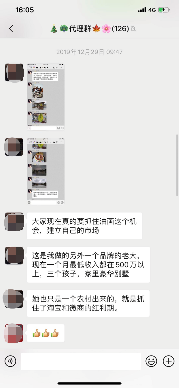 这是代理群的几条消息,关于XX做微商赚了多少钱,买了豪车,住了别墅,成为了人生赢家。
