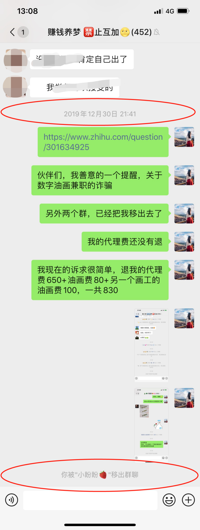 然后,我就进到了三个群里:赚钱养梦、画工群和代理群(这是后来我被突然移除群之后的截图)。