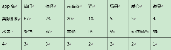 美颜相机中搞怪效果较多,卖萌贴纸的细项分布比较平均。