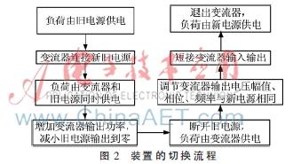 变流器J1是整个切换装置的核心部分,通过利用变流器可灵活调节输出电压的幅值、相位、频率的特点,完成负载在新、旧电源之间的平滑的功率交接。下面首先通过介绍装置的切换流程理解装置的工作原理,然后具体讲解图1的切换过程,如图2所示。