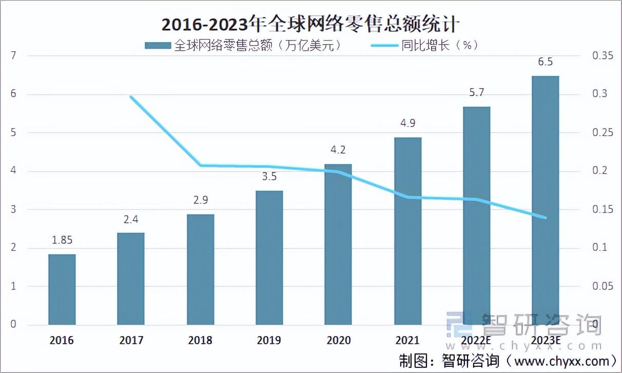 随着全球电子商务的持续发展,网络购物已经成为全球居民的一种重要消费方式,近年来全球网络零售总额逐年攀升,2021年全球网络零售总额达4.9万亿美元,较2020年增加了0.7万亿美元,同比增长20.73%,未来将继续保持增长,预计2023年全球网络零售总额将达到6.5亿美元。