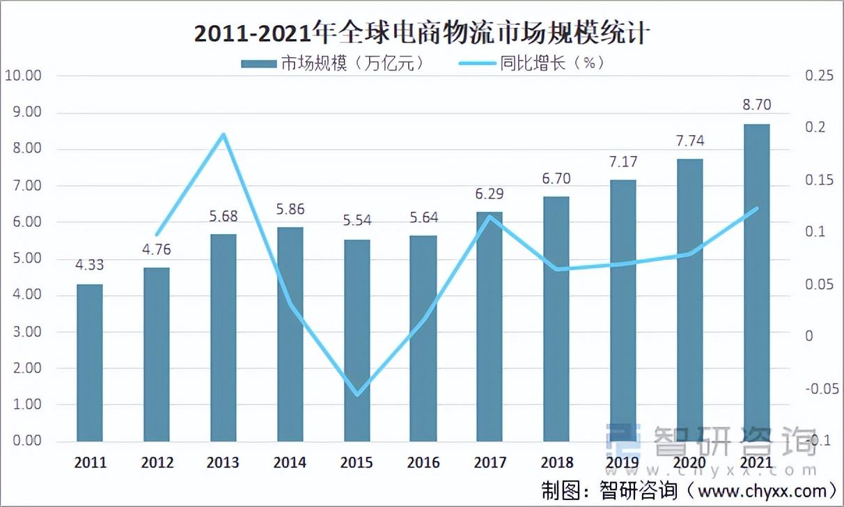 随着电子商务的发展,尤其是网络购物的爆发式增长,大大促进了电子商务物流服务业的发展,使其成为社会商品流通的重要渠道,2021年全球电商物流市场规模达8.70万亿元,较2020年增加了0.96万亿元,同比增长12.44%。